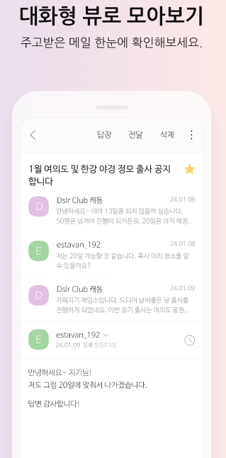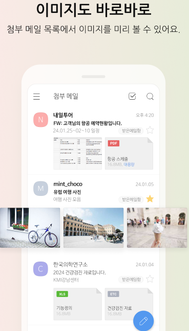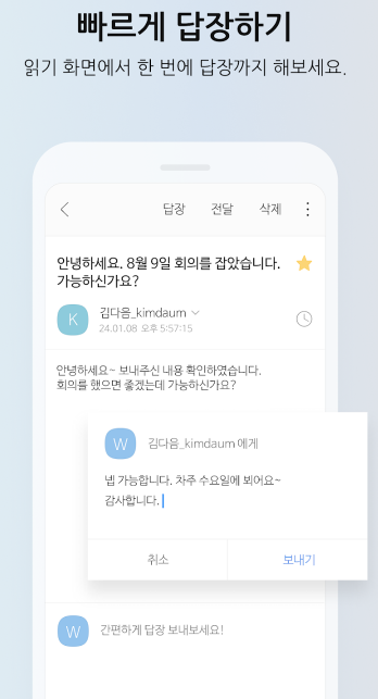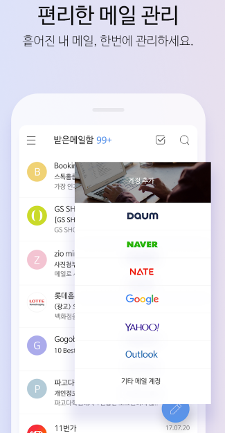 앱 하나로 모든 메일 관리 끝! Daum 메일 뿐 아니라 네이버, 구글 메일까지 연결해 쓸 수 있습니다! 지금 바로 설치해 보세요.