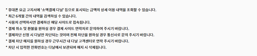 - 다날 소액결제 조회를 통해 이용일자, 서비스명, 금액, 결제처 등 상세 정보 조회 가능