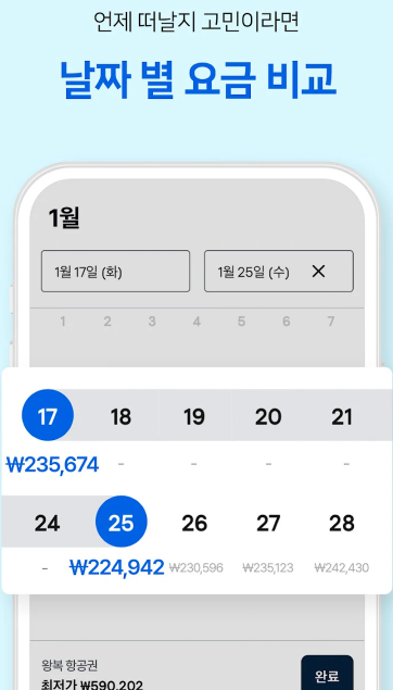 - 최저가 달력, 그래프 보기: 날짜별 최저가를 한눈에 확인, 일정 유연한 여행자 필수