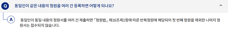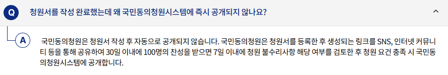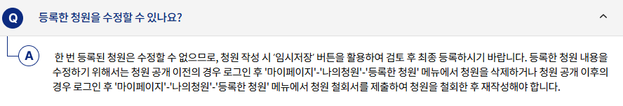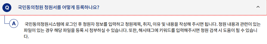 - 청원 등록: 국민 누구나 온라인으로 청원을 등록할 수 있습니다.