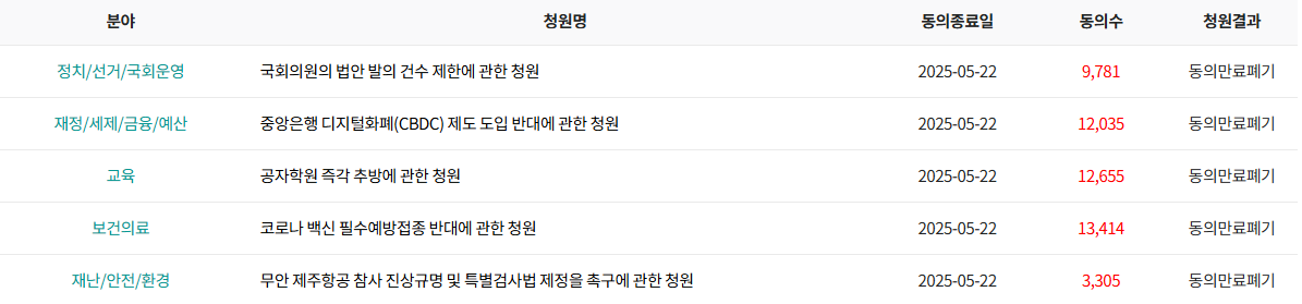 - 청원 검색 및 열람: 누구나 현재 진행 중이거나 종료된 청원의 내용을 자유롭게 열람할 수 있습니다.