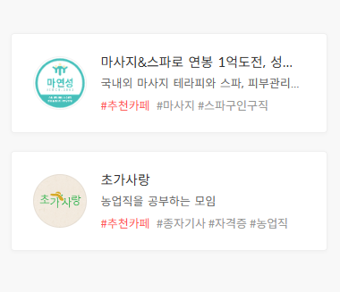 다음 카페는 1999년부터 운영되어 온 국내 대표 커뮤니티 플랫폼으로, 다양한 주제의 소모임부터 전문가 집단, 기업형 카페까지 수많은 커뮤니티가 존재합니다. 개인부터 단체까지 누구나 카페를 개설하고 운영할 수 있으며, 게시판, 갤러리, 캘린더, 채팅 등 다양한 기능이 지원됩니다.