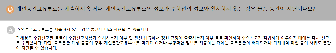 세관 시스템에서 부호와 실제 수령자 정보가 일치하는지 검토합니다. 이때 정보가 불일치하거나 부호가 누락되면, 보류 또는 통관불가 처리될 수 있습니다.