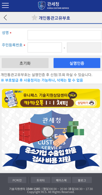 - 관세청 개인통관고유부호 조회 페이지 접속
