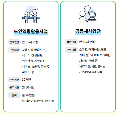 - 만 60세 이상 고령자 대상 공공형, 사회서비스형, 시장형 일자리 통합관리