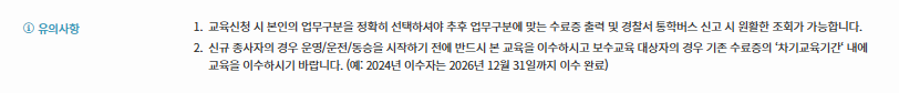 - 수료하지 않으면 면허 재발급이 지연되거나 행정처분을 받을 수 있으므로, 미루지 말고 빠르게 진행하세요.