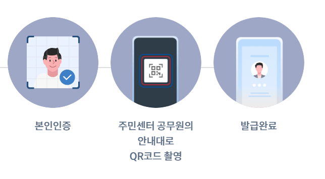 - 모바일 주민등록증 발급방법은 주민센터 방문 > QR스캔 > 생체 인증의 순서로 진행